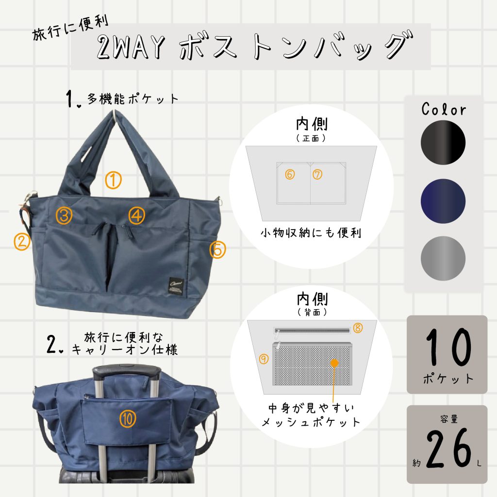 機能性とデザイン性を両立した、頼れるボストンバッグです